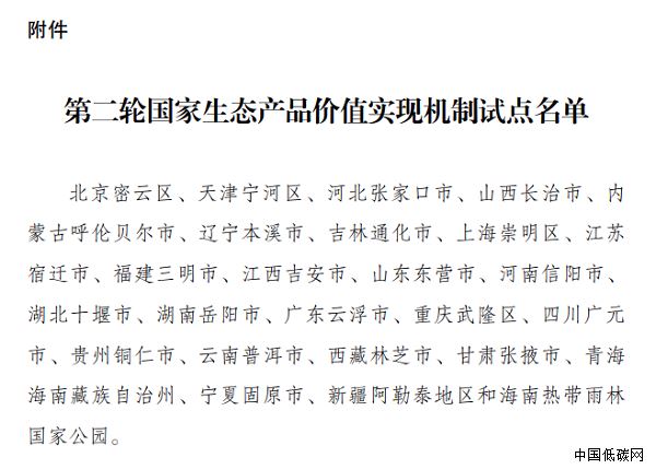 為深入貫徹黨的二十大和二十屆歷次全會精神,認真落實黨中央、國務院決策部署,加快推進中共中央辦公廳、國務院辦公廳《關于建立健全生態產品價值實現機制的意見》重點任務落實,經部門推薦、征求地方意見等程序,確定北京市密云區等25個地區和海南熱帶雨林國家公園為第二輪國家生態產品價值實現機制試點,試點期限為2026-2028年?,F將第二輪試點名單予以公布,并就有關事項通知如下: